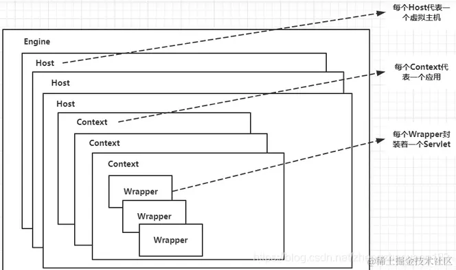 【1】顶层元素: 元素是整个配置文件的根元素,元素代表一个 Engine元素以及一组与之相连的 Connector元素。 【2】连接器: 代表了外部客户端发送请求到特定 Service的接口;同时也是外部客户端从特定Service 接收响应的接口。 【3】容器: 容器的功能是处理 Connector接收进来的请求,并产生对应的响应。Engine 包含Host,Host 包含 Context。一个 Engine组件可以处理 Service中的所有请求,一个 Host组件可以处理发向一个特定虚拟主机的所有请求,一个 Context组件可以处理一个特定 Web应用的所有请求。