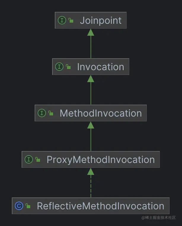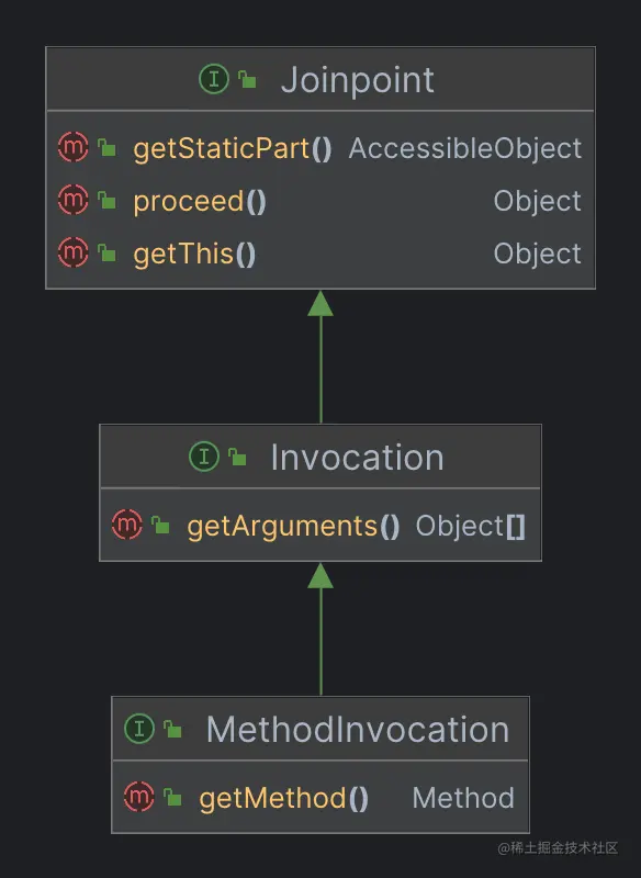 它的继承关系也比较简单,主要就是实现了一些接口,其中包括代码中声明invocation变量的 MethodInvocation。我们再看一下 MethodInvocation 及其继承的接口中都声明了哪些方法。