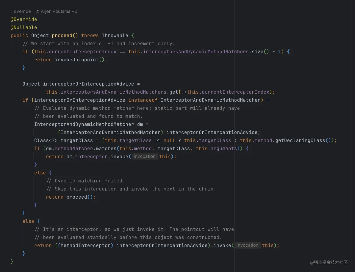 也就是说,拦截器链中的拦截器都是 MethodInterceptor 的实现类,而 MethodInterceptor 中声明的唯一方法invoke方法的参数就是 MethodInvocation 类型。跟上面声明的invocation对象类型相同,因此这两者之间存在着紧密的关系。