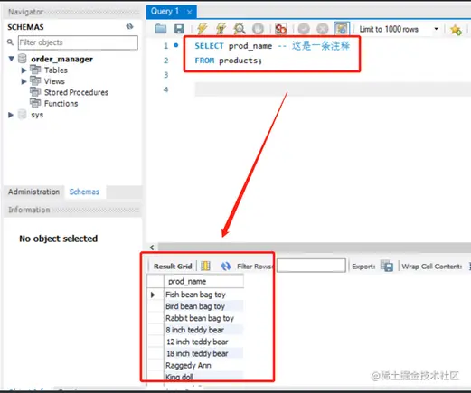 举个例子,我们要从数据库 order_manager 的 products 表中查询商品名称信息。在查询之前,我们首先来看下导航面板,现在 sys 数据库的字体是加粗的,这表明当前选中的数据库是 sys。