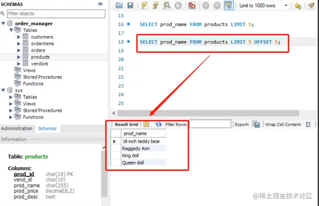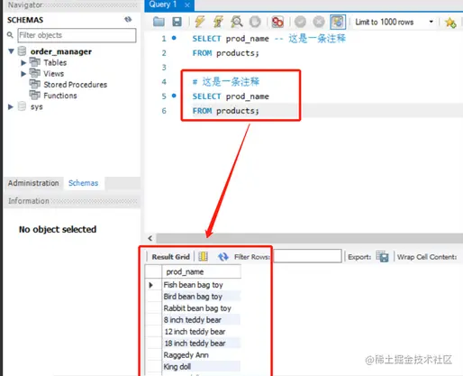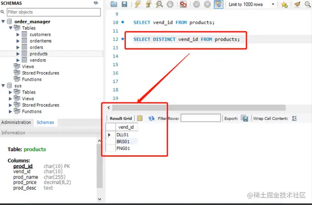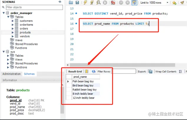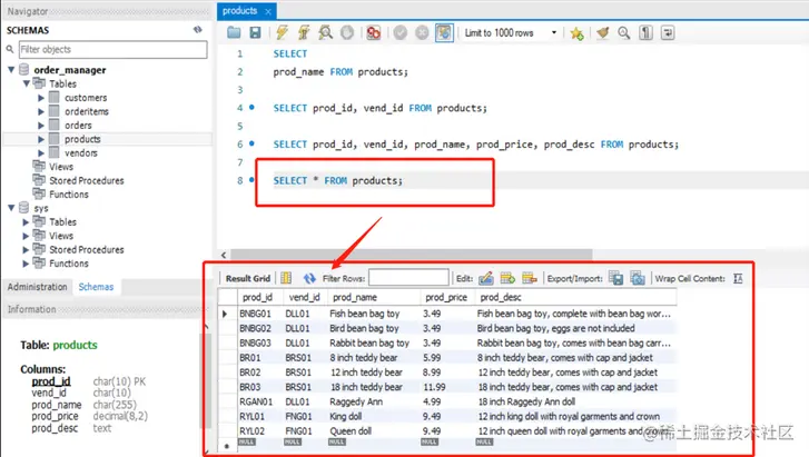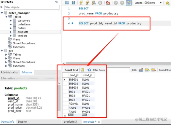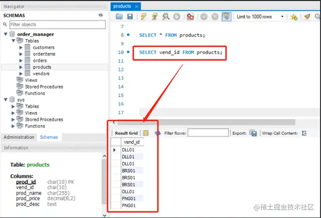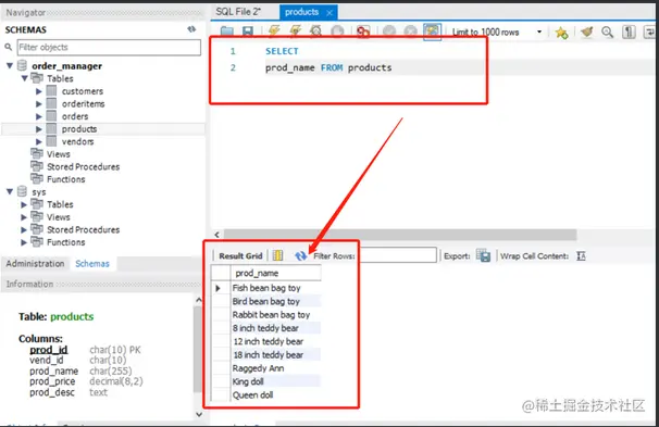 下面我们来演示下,如何从 products 表中查询 prod_name。