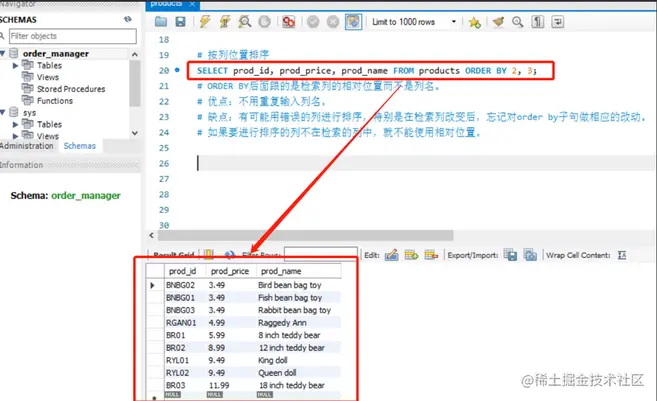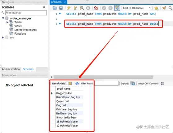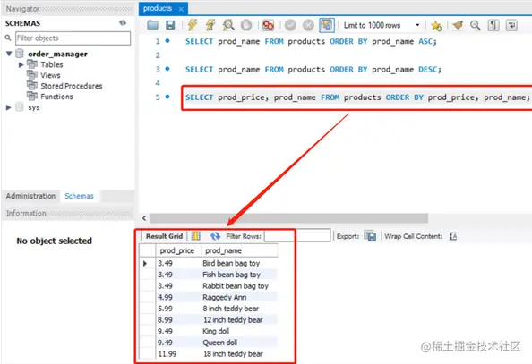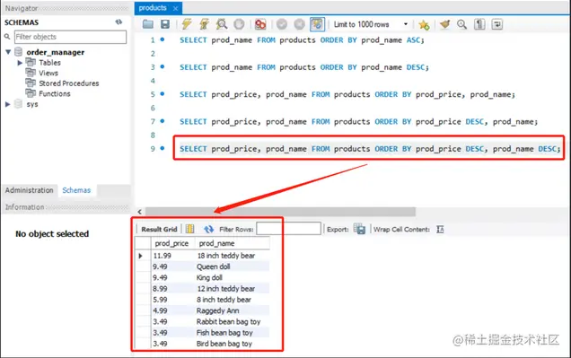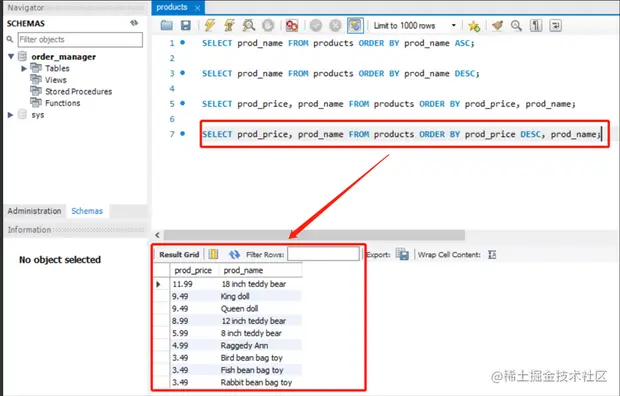 我们可以看到,结果按照 prod_price 进行了降序排序,但是当 prod_price 相等时,prod_name 还是按照升序进行排序,这说明 DESC 关键字只对位于其前面的列名起作用,