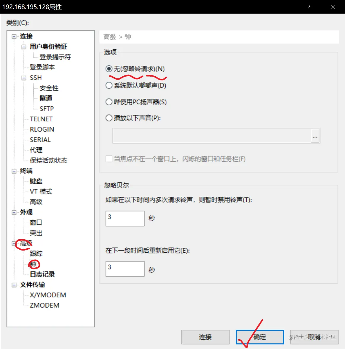 去掉烦人的XShell警告声 konley 2022-10-29 26 阅读1分钟 本文已参与「新人创作礼」活动,一起开启掘金创作之路。 XShell6的提示音嗡嗡嗡是真的烦,顺手删掉 右键会话,点击属性 高级菜单,下拉选择 钟 或者Bell 把声音改成无即可