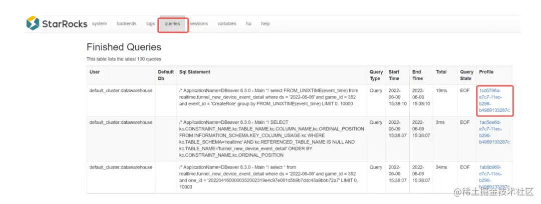 - Profile 是 BE 执行后的结果,包含了每一步的耗时和数据处理量等数据,可以通过 StarRocks Manager 的图形界面查看详细内容。