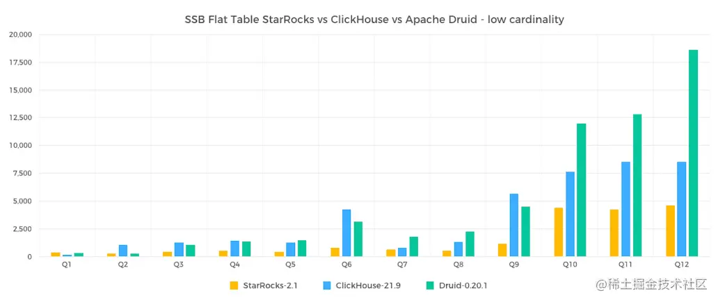 下图是基于把星型模型改成单表并用 SQL 查询语句进行测试的结果展示,StarRocks 性能远超 ClickHouse 与 Apache Druid(以下简称 Druid),在低基准数据聚合的查询对比方面,StarRocks 同样具备更优的查询性能。
