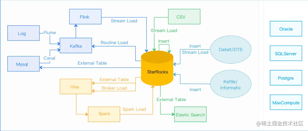引入 StarRocks 后,以 StarRocks 为核心,存算一体,数据无需在多个组件间导入导出,还能使用多种组件的外表,提高数据流通性,便于查询分析。