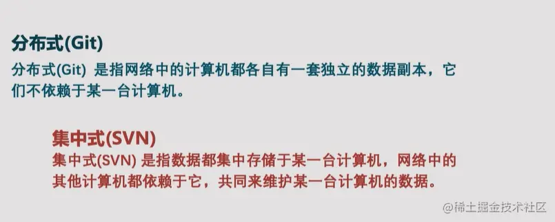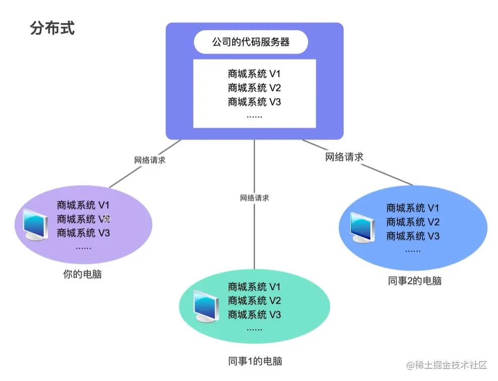 分布式(Git)是指网络中的计算机都各自有一套独立的数据副本,它们不依赖于某一台计算机。