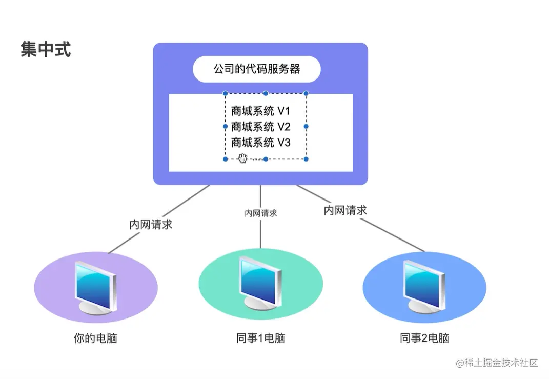 集中式(SVN)是指数据都集中存储于某一台计算机,网络中的其他计算机都依赖于它,共同来维护某一台计算机的数据。