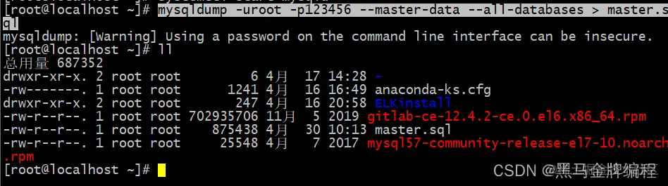 mysqldump -uroot -p123456 --master-data --all-databases > master.sql