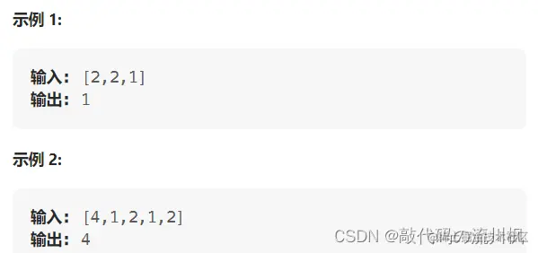 给定一个非空整数数组,除了某个元素只出现一次以外,其余每个元素均出现两次。找出那个只出现了一次的元素。