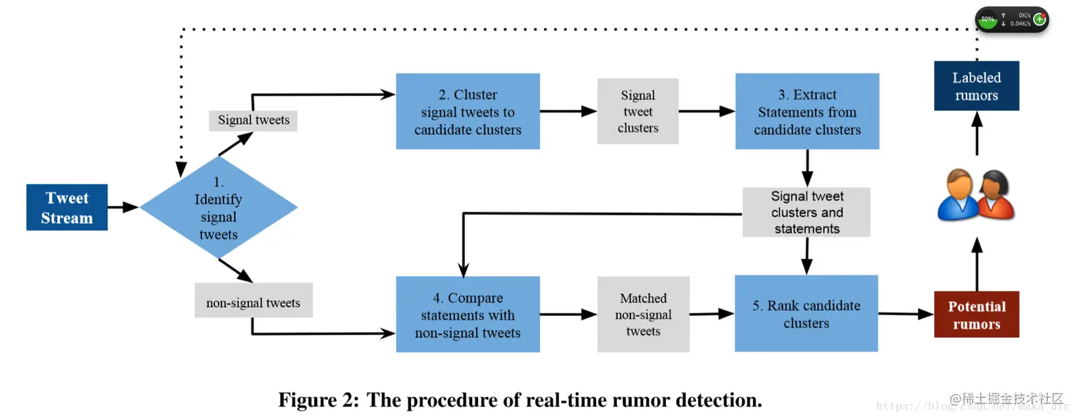 方法方面,作者使用Jaccerd系数来衡量两个推特文本之间的相似性,使用 Minhash algorithm 算法减少N-gram向量空间的维度,使得计算Jaccerd相似性的速度更快,对于一个谣言簇,作者提取了最频繁的3个词?还是子串作为一个谣言簇的summarized statement,并且通过这个summarized statement来提取样本中没有质疑信号量推文,接下来作者统计了13个统计特征来训练分类器: