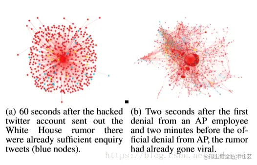 作者使用了波士顿马拉松事件作为引例,说明了谣言的危害性,但是谣言揭穿网站依赖着人工的方式去判断是否为谣言,而且覆盖的范围有限,因此会导致谣言在网上蔓延,作者又使用了白宫爆炸案的谣言说明在60秒后有很多人对这个事件的真实性表示怀疑态度,如下图所示: