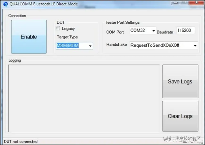 (5) 配置被测手机,进入控制电脑的“C:\Program Files (x86)\Qualcomm\QDART\bin”路径下,运行“QC.BluetoothLE_DirectMode.exe”工具,按照下图进行设置。COM需设置为系统识别的串口/USB转换口,握手方式需设定为“RequestToSendXOnXOff”。此后点击Enable按钮,使得手机进入低功耗蓝牙的测试模式。