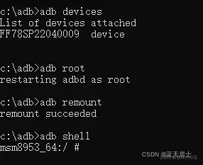 (2)在cmd命令行下输入“adb shell”命令,如果需要权限可以先行输入“adb root”、“adb remount”。如下图所示: