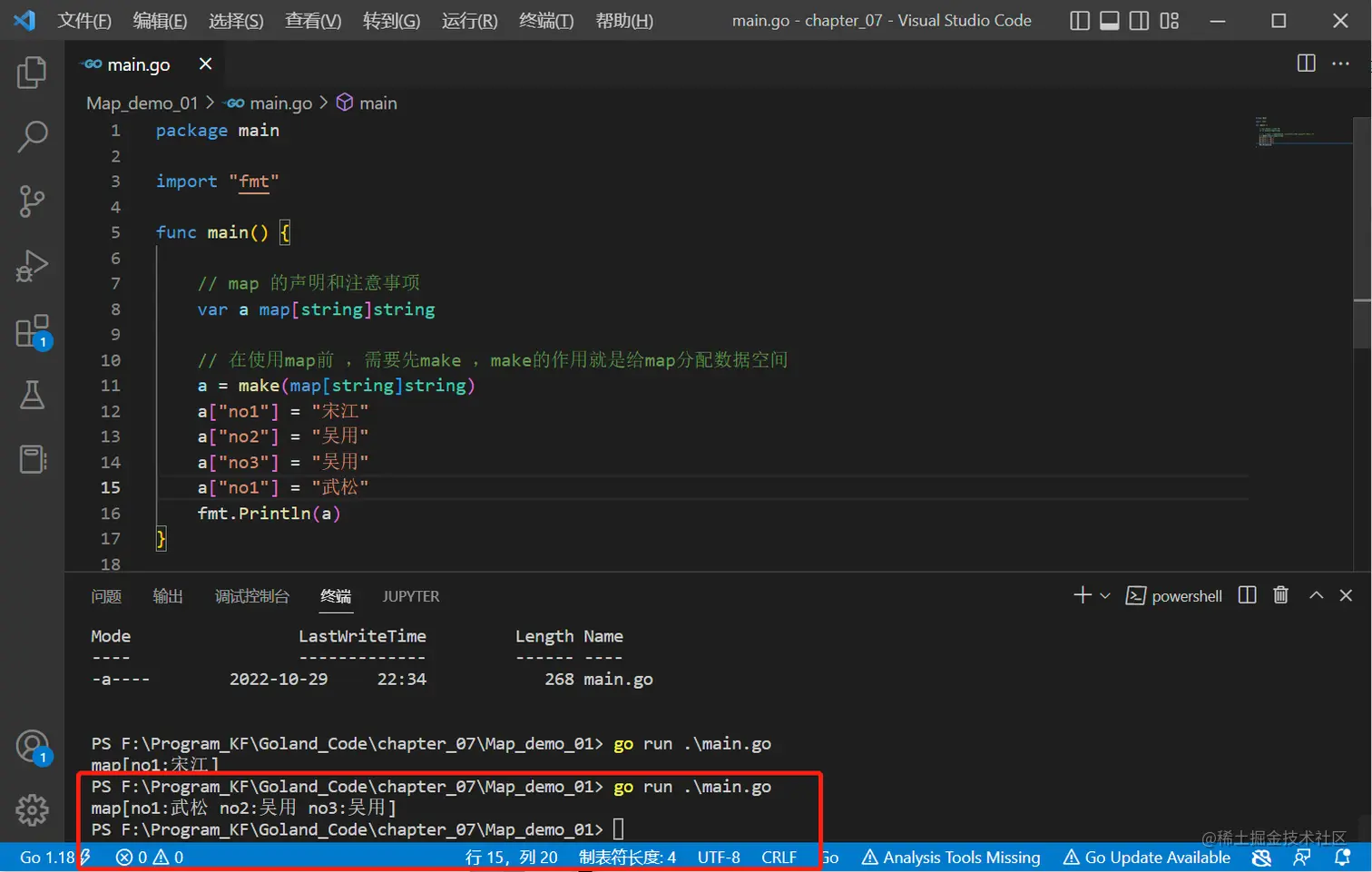 // 在使用map前 ,需要先make ,make的作用就是给map分配数据空间