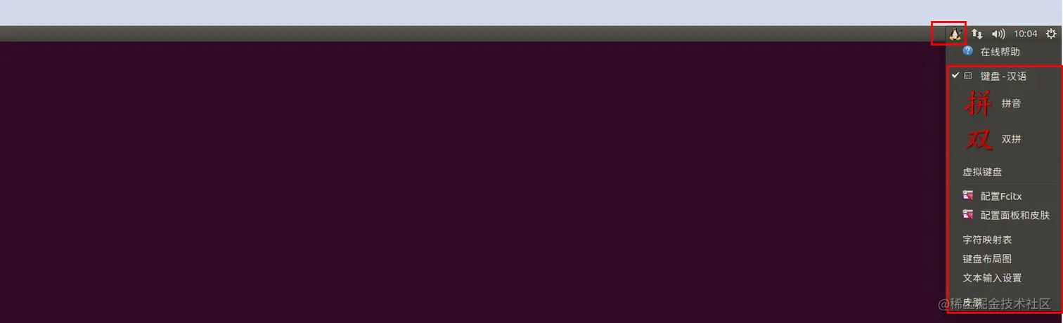 Linux下使用: Ctrl + 空格按键切换输入法,或者鼠标点击左上角的输入法进行选择。