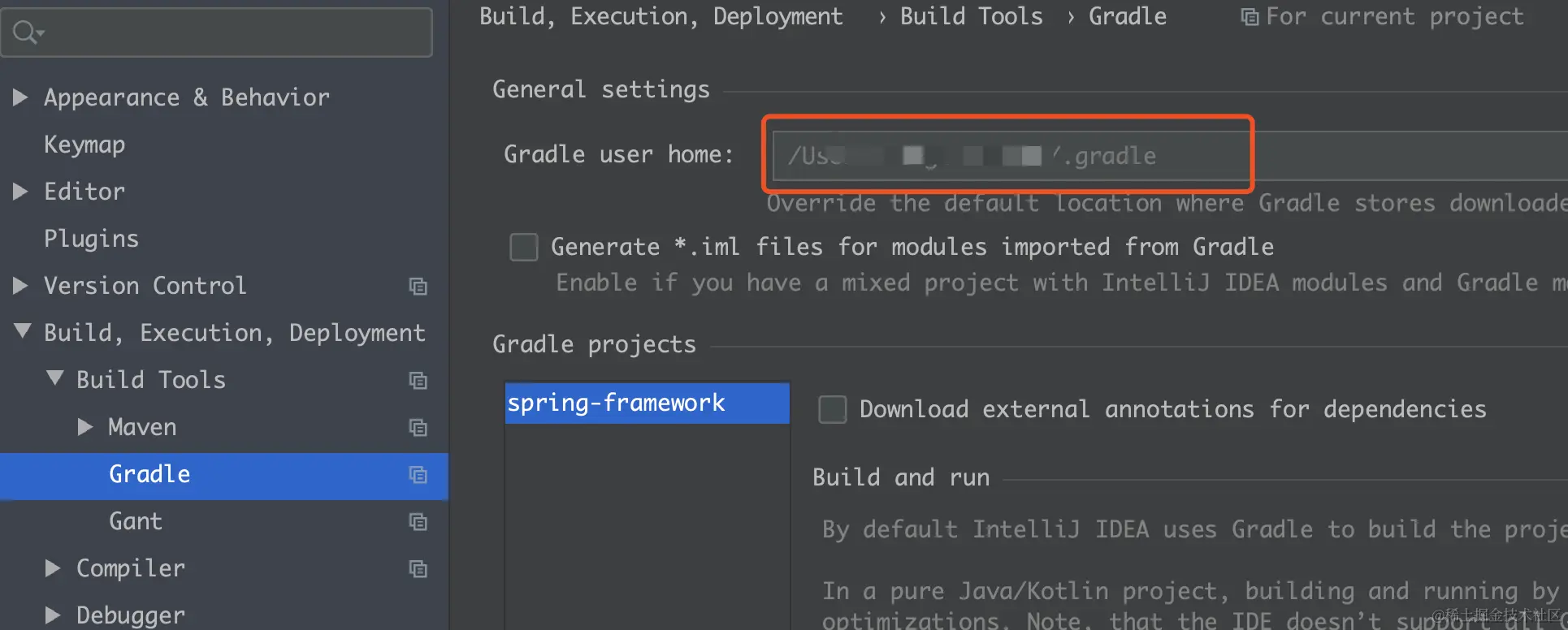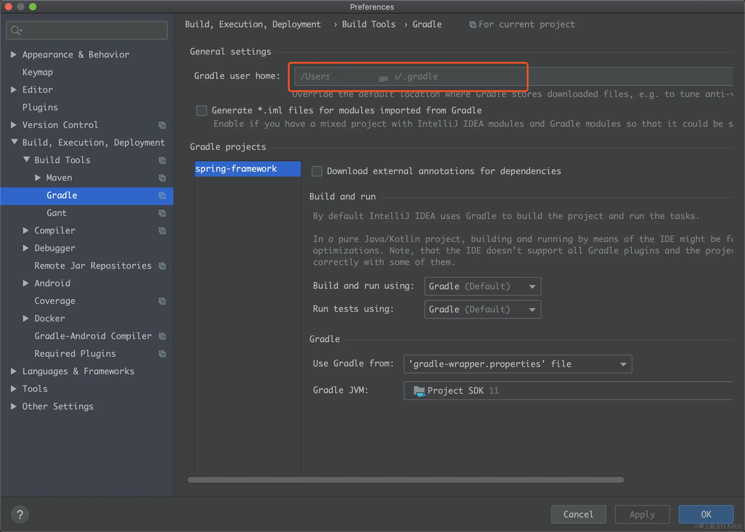 这里的gradle user home也要填写maven本地仓库地址。maven本地仓库地址默认为~/.m2/repository/.