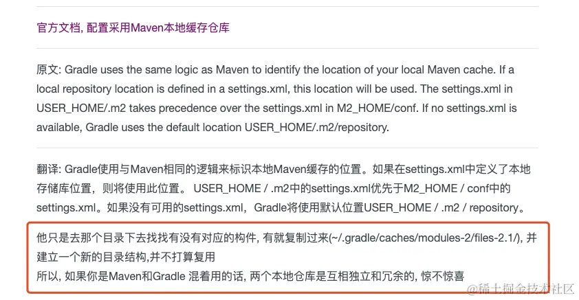为了配置让两者使用同一仓库,本人在网上阅读了大量博客,配置方式大同小异,其中发现一篇博客遇到了与我同样的问题:Gradle 使用Maven的本地仓库(坑),将博客中关于失败的内容摘录如下: