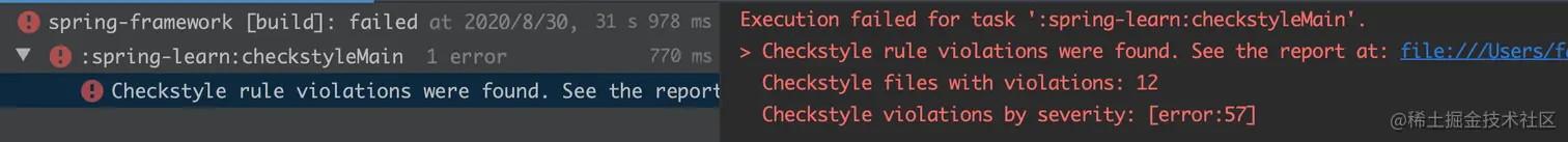 spring作为一个庞大的项目,在多人开发下,为了保证代码风格统一,使用了checkstyle插件,如果违反了代码风格,编译时就会报错: