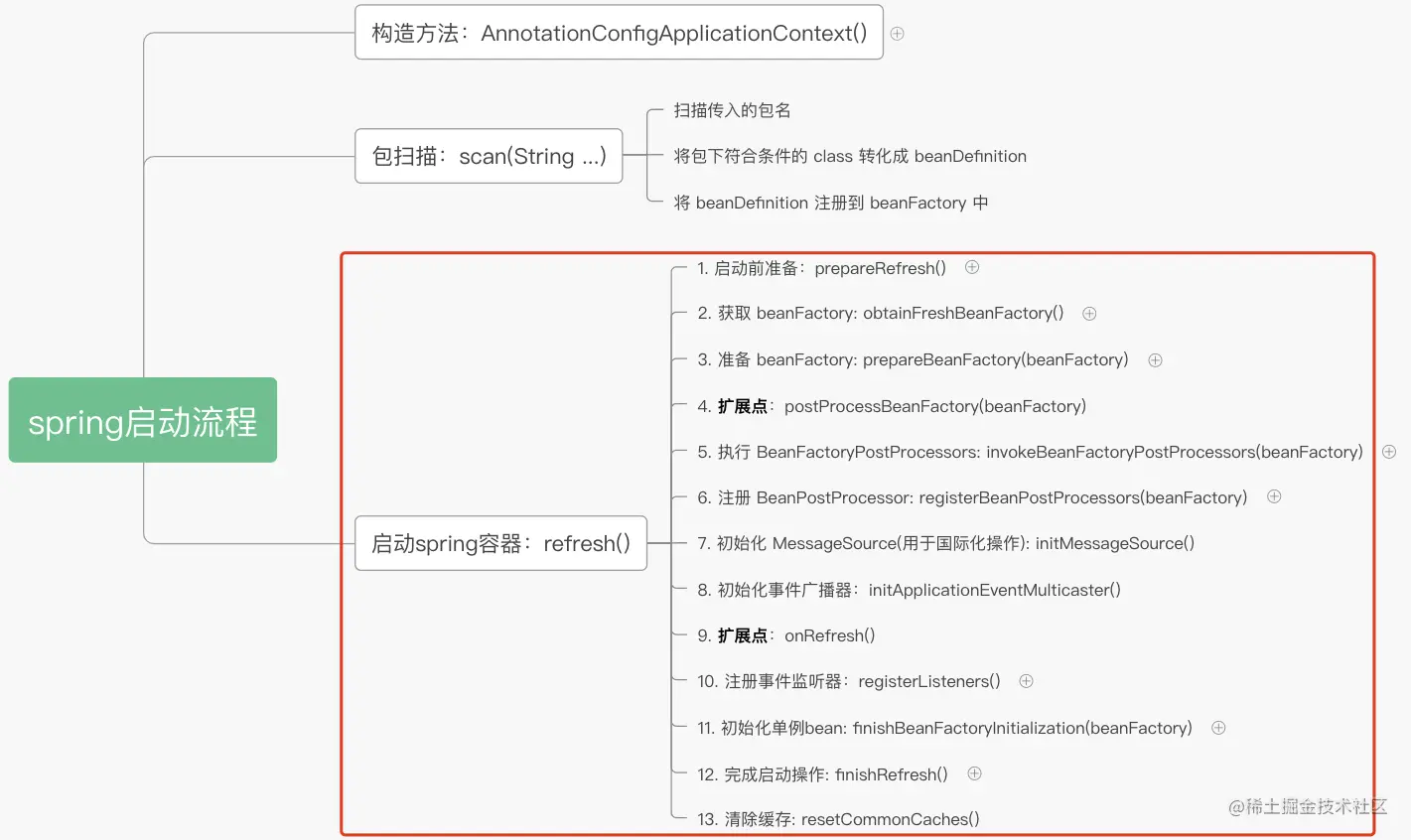 完成包的扫描后,接着就开始了spring的启动了,即AbstractApplicationContext#refresh方法,该方法一共包含13个操作,涵盖也spring启动的整个流程: