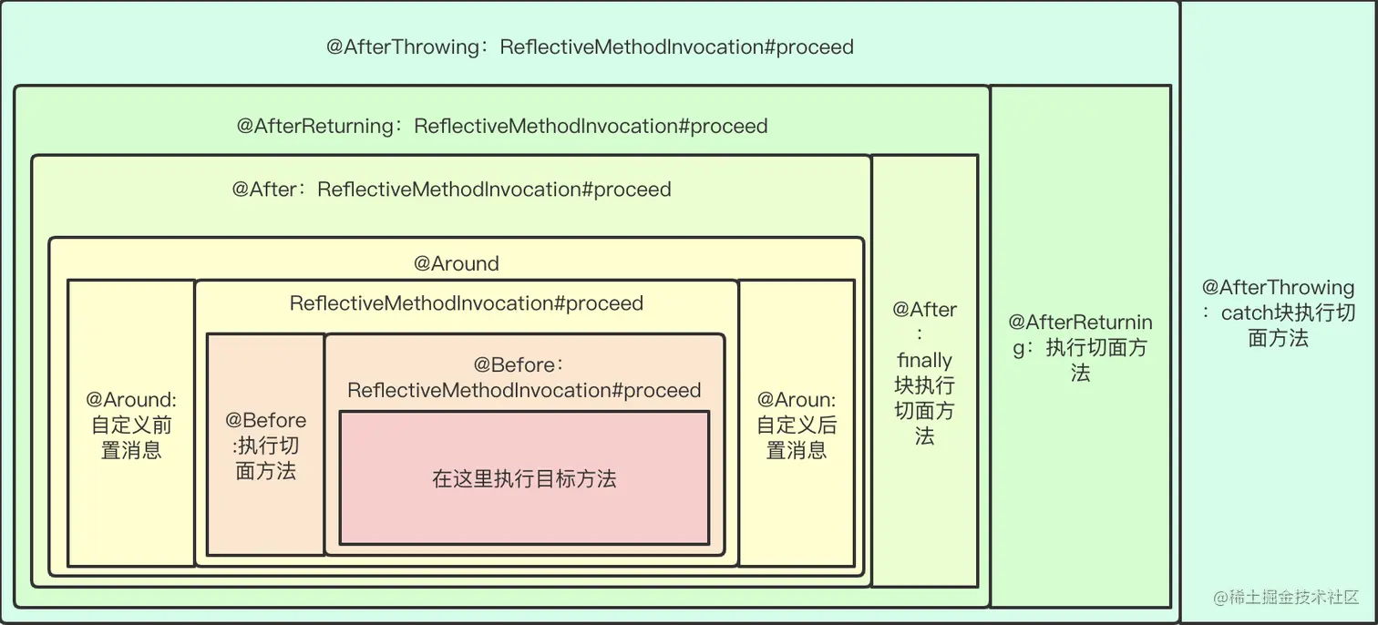 mi.proceed()时会执行@Before通知,执行时会先执行切面方法,再调用mi.proceed()执行下一个拦截器; - 拦截器链执行到最后,发现没有可执行的拦截器了,此时就开始执行目标方法。