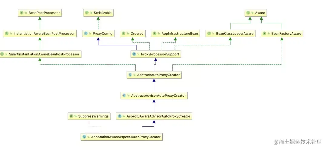 AnnotationAwareAspectJAutoProxyCreator是BeanPostProcessor的子类,spring在bean的初始化前后会调用BeanPostProcessor#postProcessBeforeInitialization与BeanPostProcessor#postProcessAfterInitialization方法,我们将从源码上看看AnnotationAwareAspectJAutoProxyCreator在bean的初始前后是如何完成aop操作。