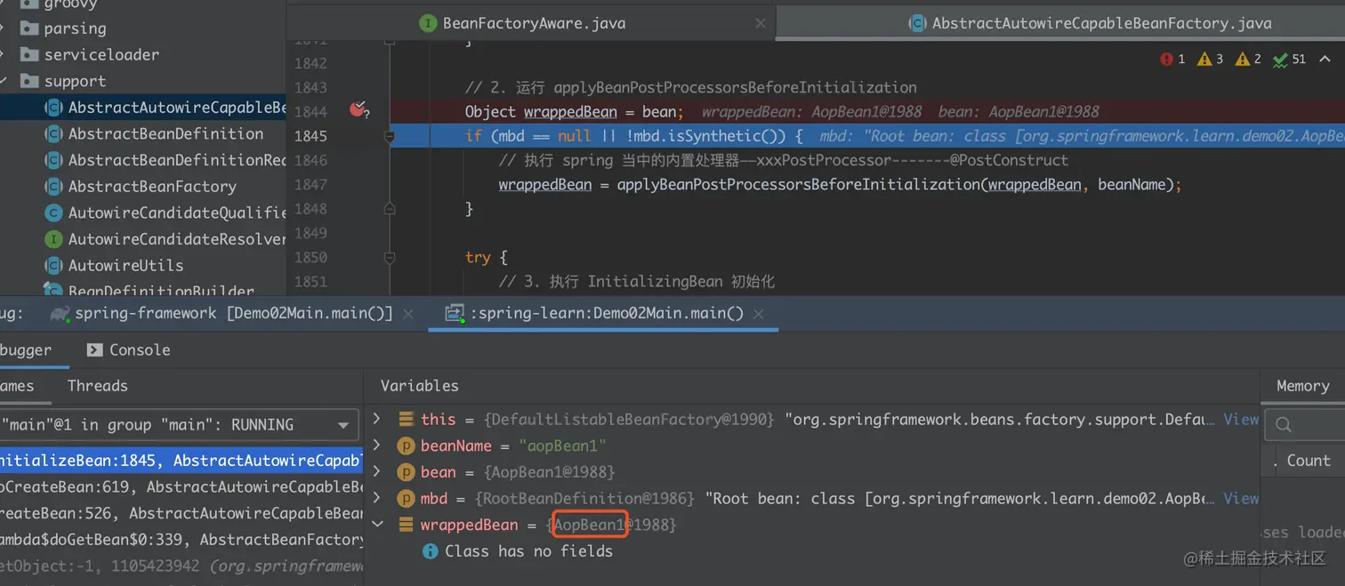 我们将断点打在AbstractAutowireCapableBeanFactory#initializeBean(String, Object, RootBeanDefinition)方法上,然后在debug模式下运行: