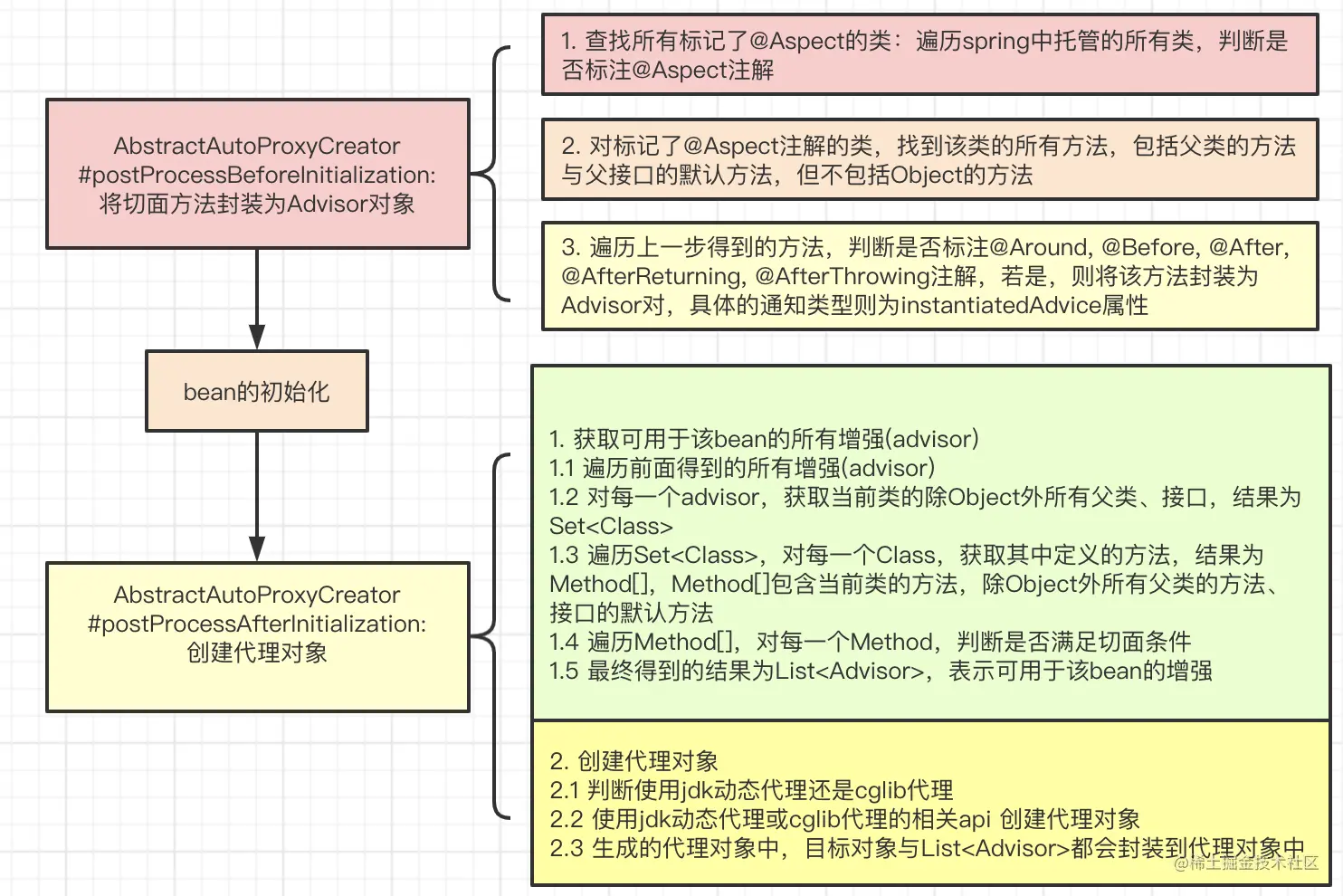 spring aop 基于注解方式的实现是通过AnnotationAwareAspectJAutoProxyCreator类来操作的,这个类是一个BeanPostProcessor,在bean的初始化前后执行的操作如下: