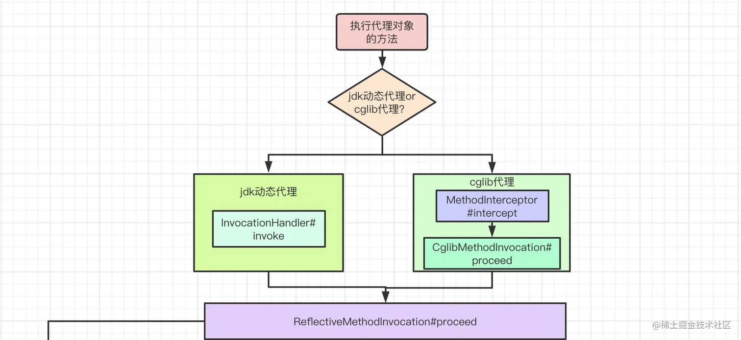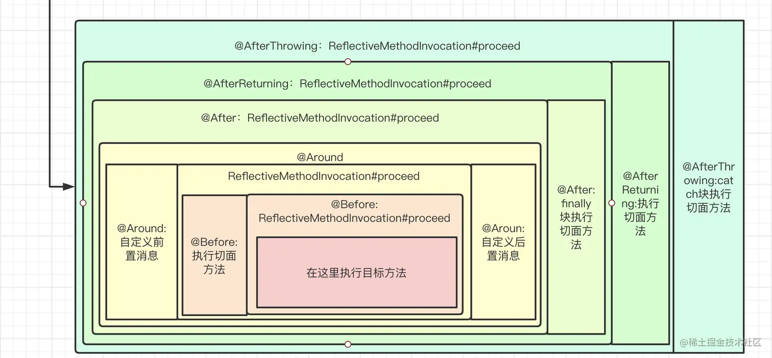 当调用代理对象的方法,jdk会根据代理的类型而选择执行InvocationHandler#invoke(jdk动态代理)还是MethodInterceptor#intercept(cglib代理),这一步在创建代理对象时,已经与代理对象结合了,开发者无法干涉调用哪个方法,不过这两个方法里的内容开发者可以自由发挥。在这两个方法中,spring会获取可用用当前方法的所有Advisors,然后执行Advisors里的切面方法,整个过程如下: