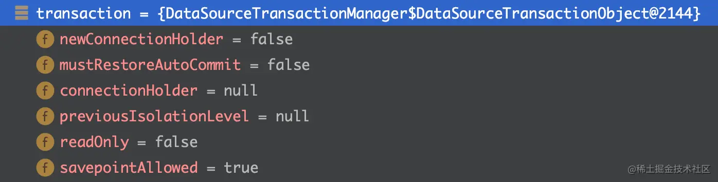 所以这个方法主要就是为了创建DefaultTransactionStatus对象!我们来看下这一步的运行结果: