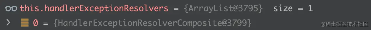 HandlerExceptionResolver是一个接口,内部只有一个方法:resolveException(...),具体的异常处理就在这个方法里实现。经过调试发现,当前的handlerExceptionResolver只有一个: