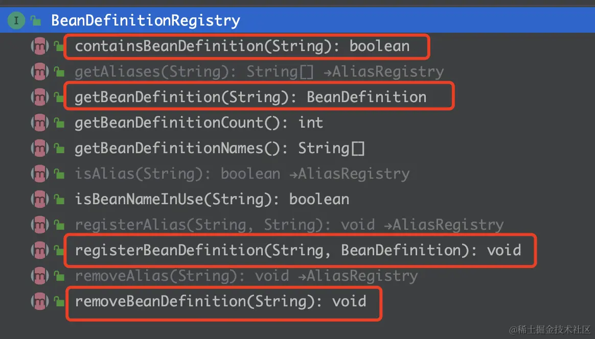 实际上,BeanDefinitionRegistryPostProcessor#postProcessBeanDefinitionRegistry主要就是使用BeanDefinitionRegistry来完成BeanDefinition的操作,它支持的方法如下: