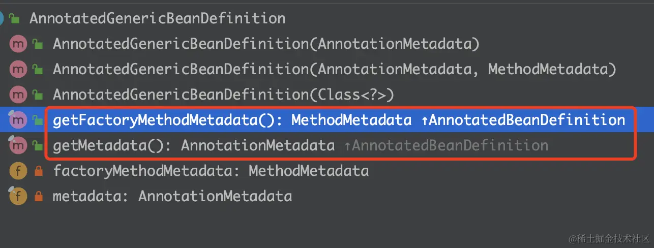 AnnotatedGenericBeanDefinition 继承了 GenericBeanDefinition,同时也实现了 AnnotatedBeanDefinition接口,本身提供的方法并不多: