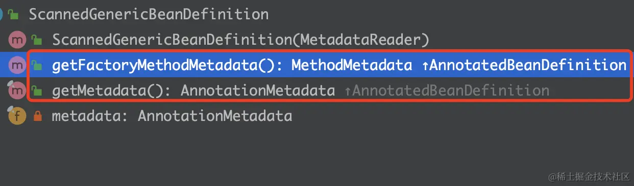 ScannedGenericBeanDefinition 继承了 GenericBeanDefinition,同时也实现了 AnnotatedBeanDefinition接口,本身提供的方法并不多: