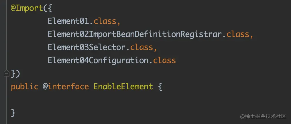 @EnableElement注解,其中的@Import注解依次引入Element01.class、Element02ImportBeanDefinitionRegistrar.class、Element03Selector.class、Element04Configuration.class