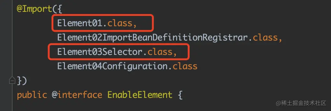 ImportSelector的类,在selectImports(...)方法中,返回Element03的"包名.类名"