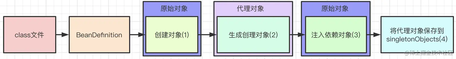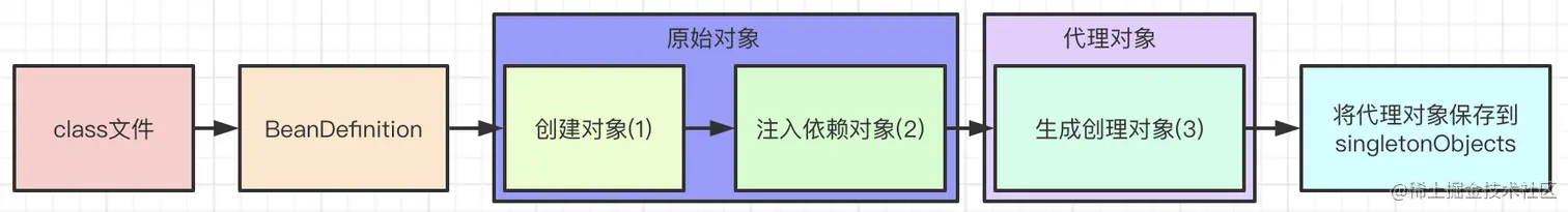 - “创建(原始对象)-->生成代理对象-->对原始对象进行属性注入-->将代理对象保存到容器中”的流程创建