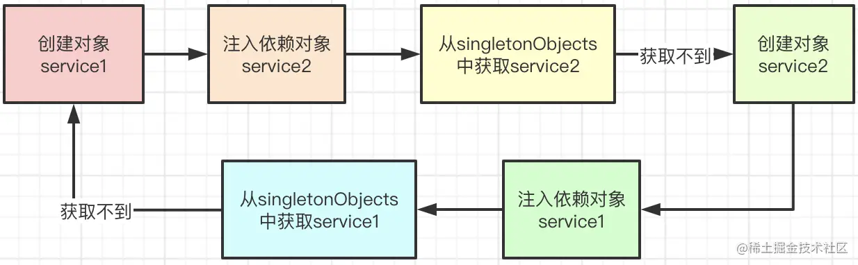 我们分析下,循环出现的原因在于,在service2获取service1时,由于singletonObjects中此时并不存在service1,因此会再走service1的创建过程,重新创建service1,因此,我们有个大胆的想法:如果在service1实例化后就把它保存起来,后面再再找service1时,就返回这个未进行依赖注入的service1,像下面这样: