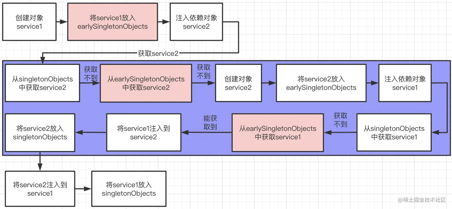 service1对象创建完成后,先将service1放入earlySingletonObjects,然后进行依赖注入; - 对