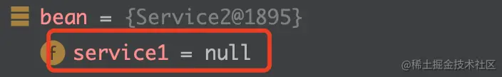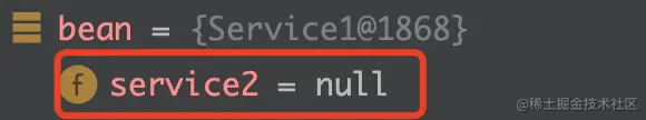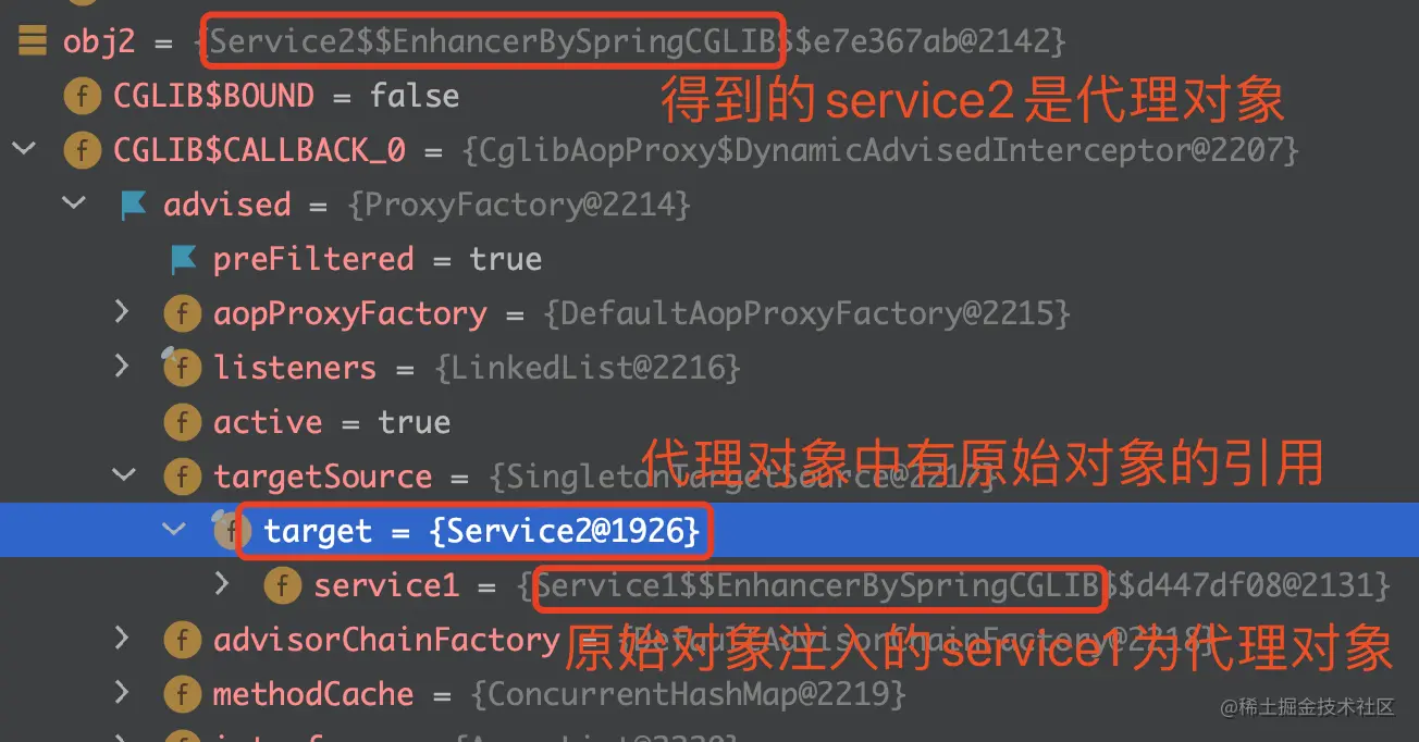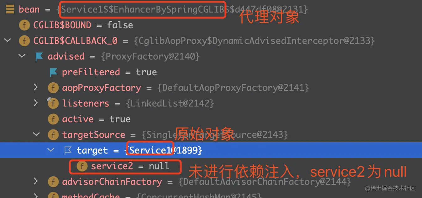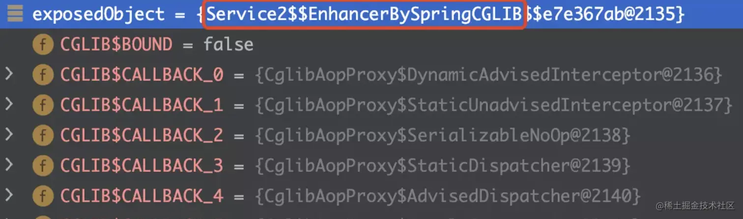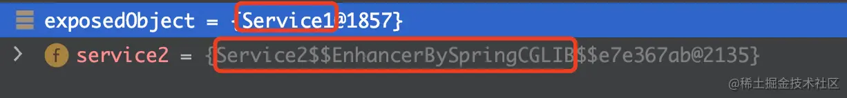 null,显然不等于传入的bean,因此if中的代码会执行,service2进行aop。执行完这一步后,得到的exposedObject为:service2也变成了代理对象,且已完成了依赖注入。 -