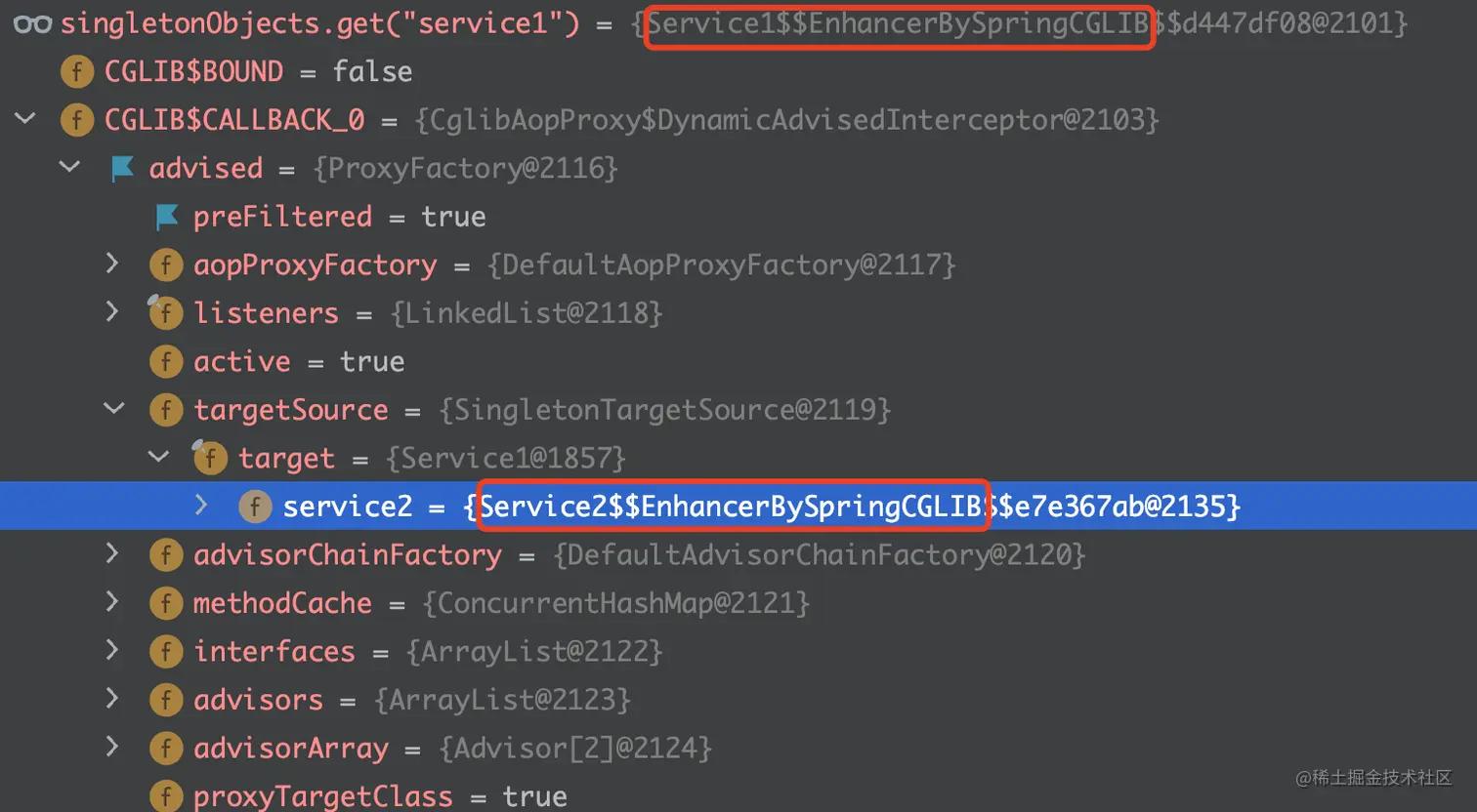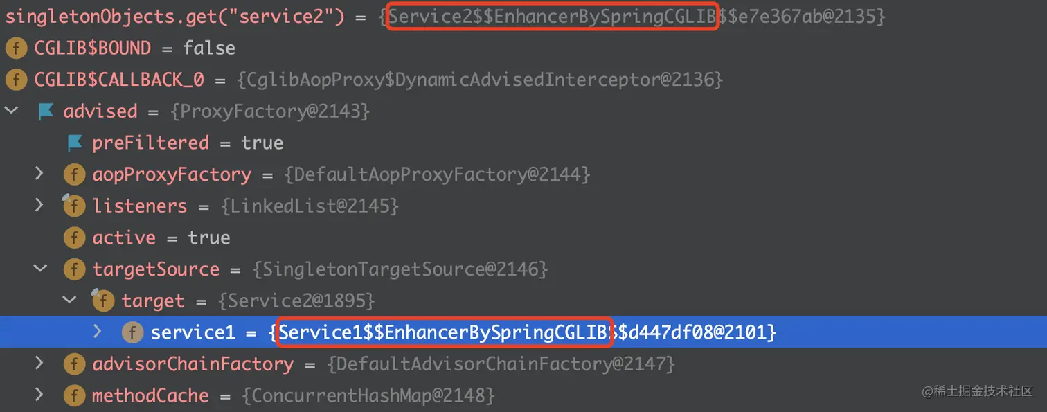 结构 内容 singletonObjectsservice2$$EnhancerBySpringCGLIB earlySingletonObjectsservice1$$EnhancerBySpringCGLIB singletonFactoriessingletonsCurrentlyInCreationservice1 earlyProxyReferencesservice1