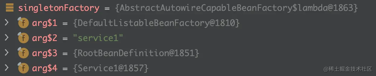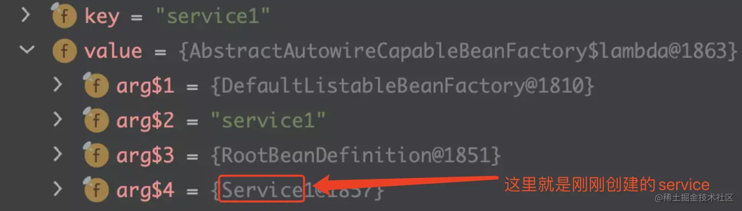 service1不是FactoryBean,与getSingleton(beanName)得到的对象是同一个对象,内容如下: -