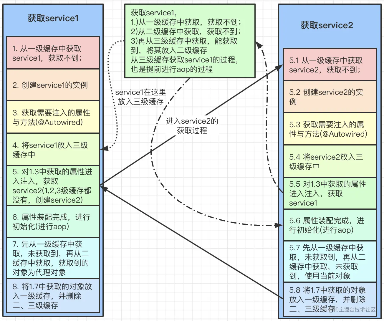 在第2节中,因为servic1需要注入service2,才有了第3节获取service2的流程,然后又经过一系列的操作后,最终在第5节成功地获取到了service2的代理对象service2$$EnhancerBySpringCGLIB,这才让service2得以完成依赖注入。
