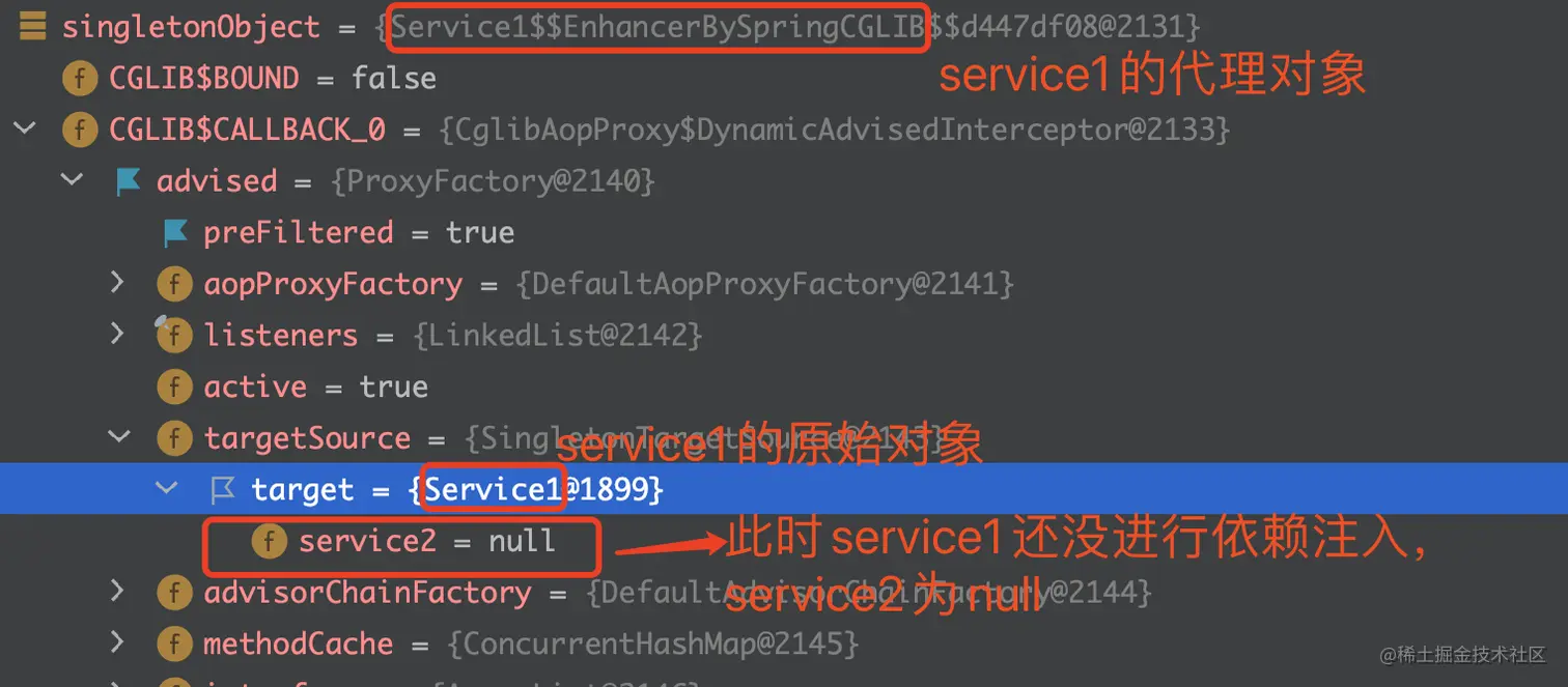到了这里,我们终于获取到了service1的代理对象,尽管代理对象对应的原始对象并没有完成依赖注入,但我们依然可以进行后续的流程,即获取到service1的代理对象后,service2就可以进行依赖注入,继续接下来的流程了。