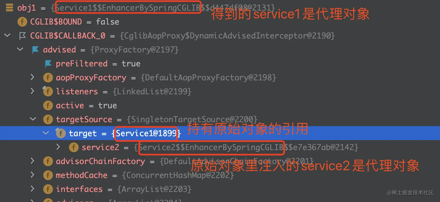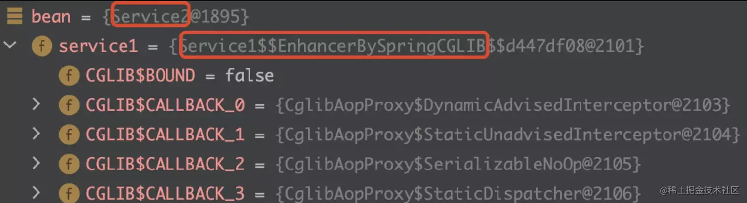 service1已经完成了依赖注入,且此时注入到service1中的service2已经是代理对象了,不过service1此时还是原始对象,我们继续往下看; -