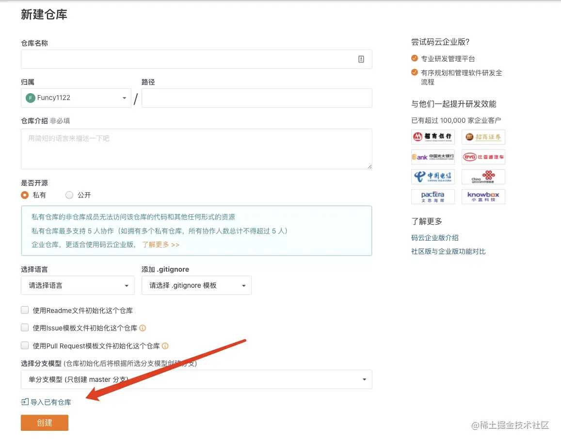 1.1 在giteee上建立一个仓库,选择导入已有仓库