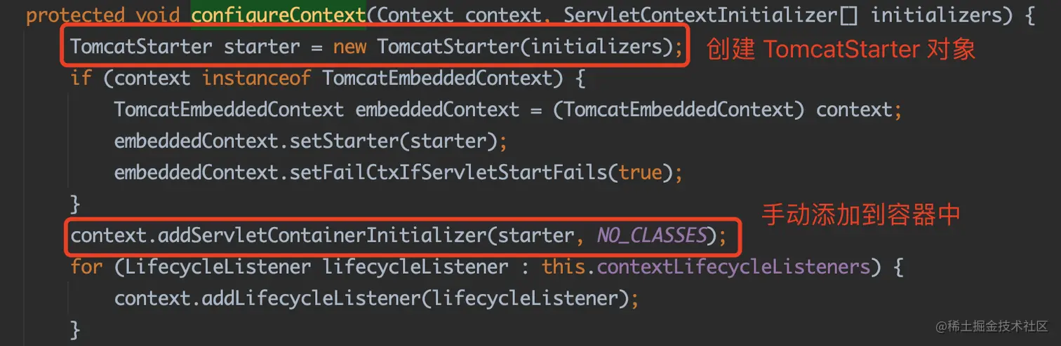 经过多次调试,发现TomcatStarter 是在 TomcatServletWebServerFactory#configureContext 中添加到tomcat容器的,关键代码如下: