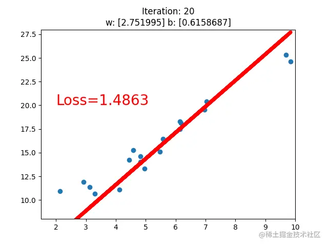 plt.text(2, 20, 'Loss=%.4f' % loss.data.numpy(), fontdict={'size': 20, 'color': 'red'})