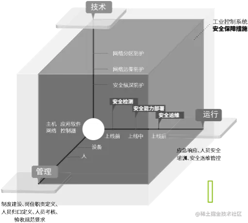 基于绿盟科技对工控系统安全需求的理解,结合国内工控安全的规范要求及国外相关标准内容,绿盟科技提出从 技术、管理和运行三个维度来保障来保障工业控制系统安全。三个保障维度中主要包含:网络边界防护、安全纵深防护、 安全运行管理和安全管理制度要求等几个方面,融合了技术、管理和运行的要求来保障工业控制系统的安全。同时,我 们结合工业控制系统运行阶段的特点,提出了针对工业控制系统的三个能力建设,包含从上线前的安全检测、安全能力 部署、安全运行三个阶段,覆盖工业控制系统运行周期的安全保障。