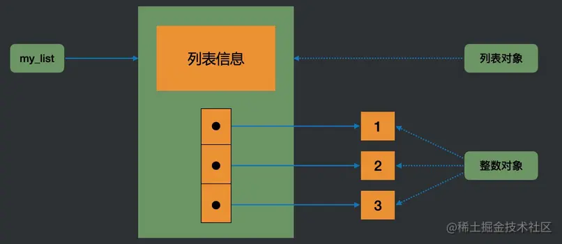 从上述代码的输出,我们可以推断出,列表对象本身(不包含元素)的大小为 56 个字节,每增加一个元素,元素本身的大小为 28 个字节,指向元素的指针大小为 8 个字节。存储的结构如下图所示: